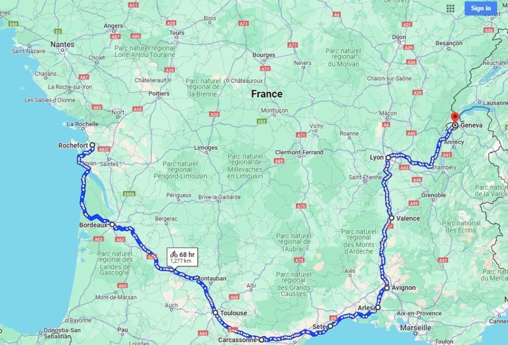 In 2024, we will ride from Rochefort, France to Geneva, Switzerland, first along Le Canal des Deux Mers (which includes the Canal de la Garonne and the Canal du Midi), and then on the ViaRhôna which follows the Rhône River from the Mediterranean Sea to Geneva, Switzerland.