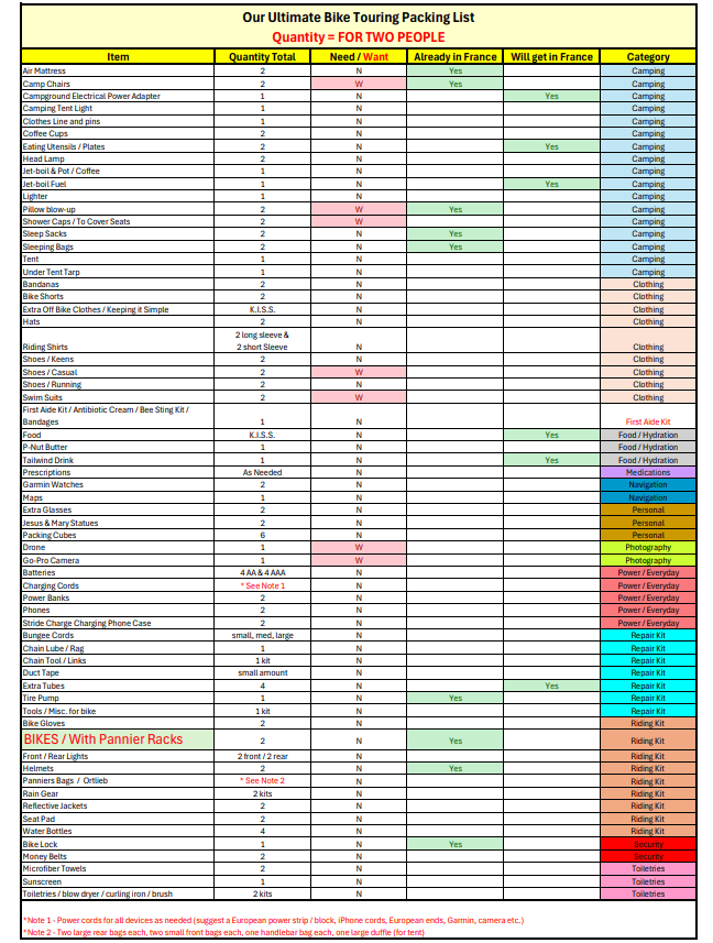 We intentionally left our bikes in France last year, so there’s no need to transport them by plane this year. Nonetheless, we must ensure we have all the necessary equipment for our four to five-week self-supported bike trip.